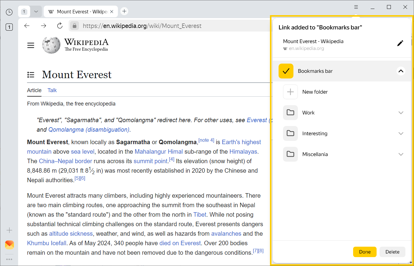 - If you want to edit the bookmark, click Saved to bookmarks. The bookmarks panel opens.