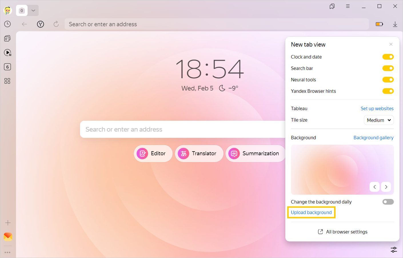 You can configure the browser to randomly alternate images or videos from your Background gallery every 24 hours.