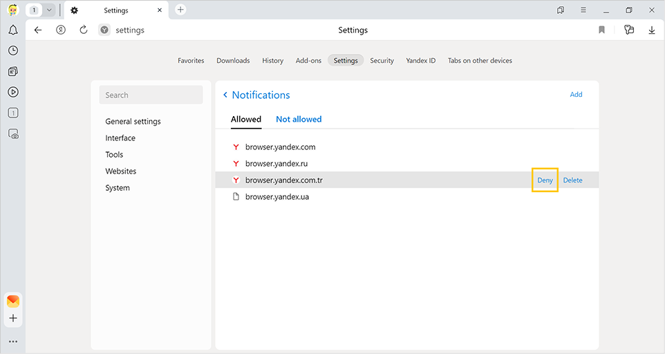 Websites can send notifications about news, comments, updates, and other events. Sites usually request permission to send notifications, but sometimes they can do this without permission. In Yandex Browser, you can allow or block notifications from a specific website, or disable notifications from all sites.