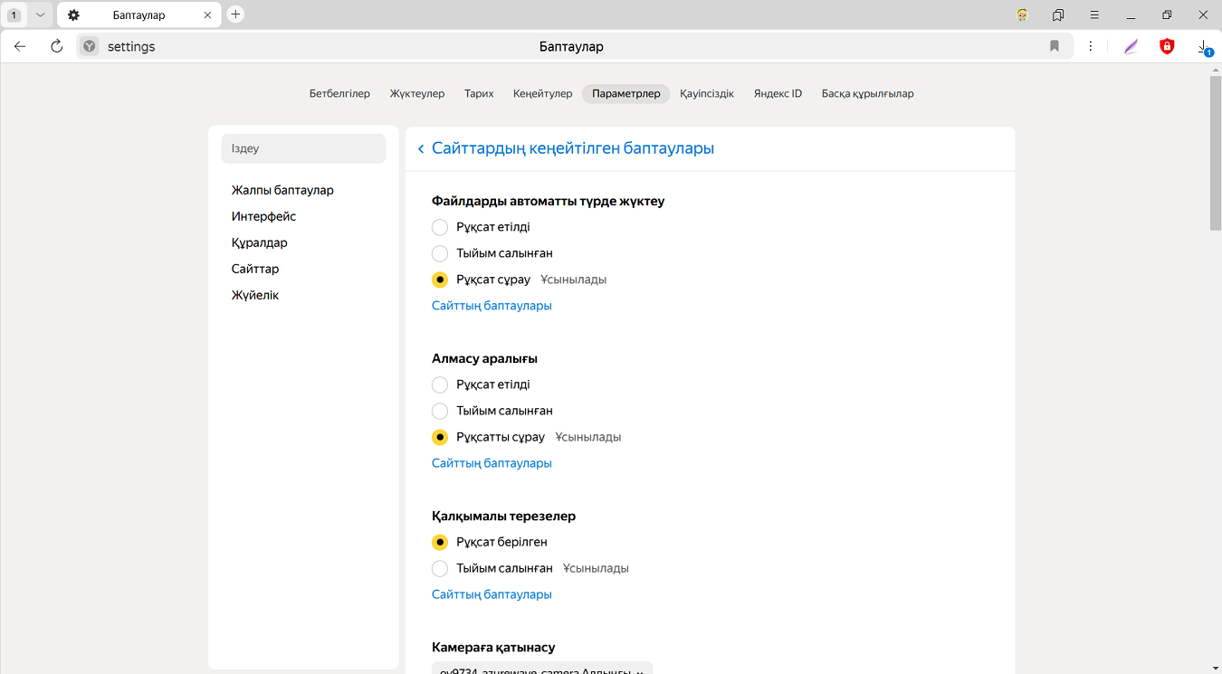 • Рұқсат ету — сайтқа бейнекамераға автоматты түрде кіруге мүмкіндік беру. Http-сайты үшін бұл баптау бір сеанс бойы әрекет етеді, ал https-сайт микрофон және келесіде кіруіне қол жеткізе алады.