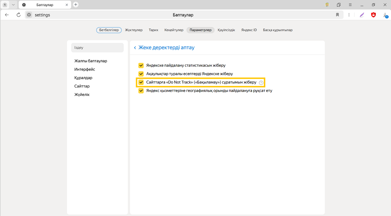 3. Сайттарға «Do Not Track» сұранымын жіберу («Бақыламау» ) опциясын қосыңыз.