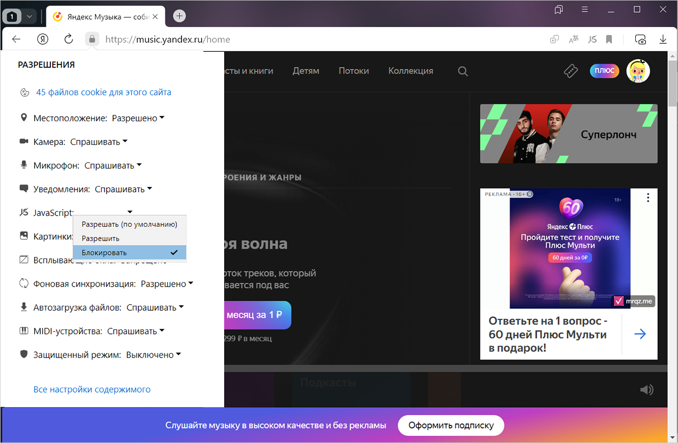 В разделе Разрешения в поле JavaScript выберите в списке Блокировать.