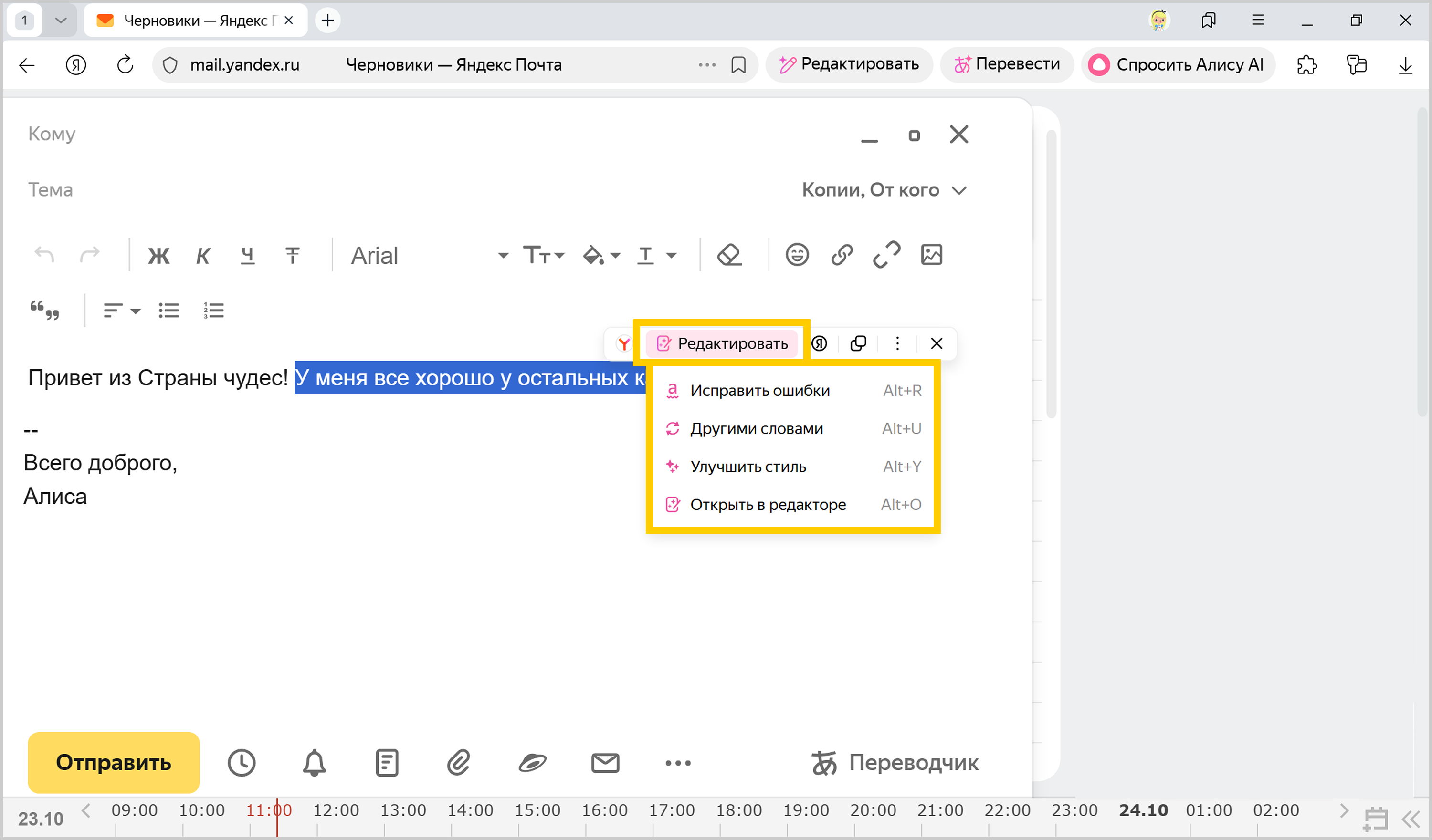 Редактор в Браузере помогает написать, отредактировать и улучшить текст, используя Алису AI. Он исправит ошибки, улучшит стиль, переформулирует или переведет текст на другой язык. Это удобно при подготовке любых текстов: от электронных писем и постов в социальных сетях до научных статей и художественных произведений.