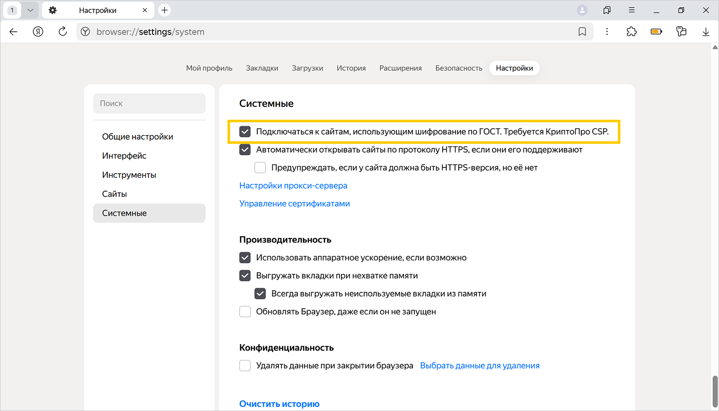 В разделе Сеть должна быть включена опция Подключаться к сайтам, использующим шифрование по ГОСТ. Требуется КриптоПро CSP.