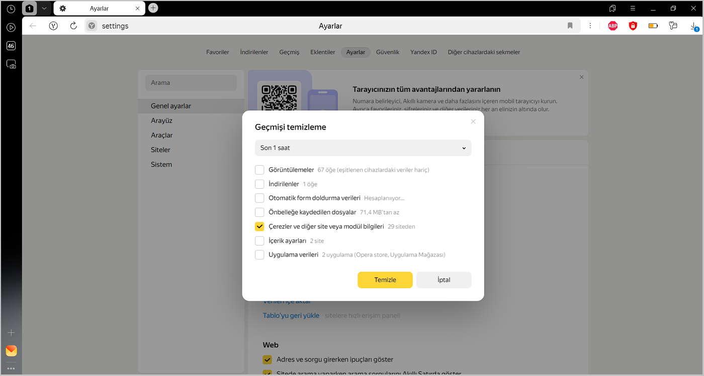 Yandex Browser ayarlarında çerez dosyaları için istisnalar belirleyebilirsiniz.