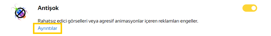 Burada, varsayılan olarak yüklenmiş eklentiler (Antişok gibi) ve ek Yandex Browser özellikleri listelenir (örneğin, eşitleme).