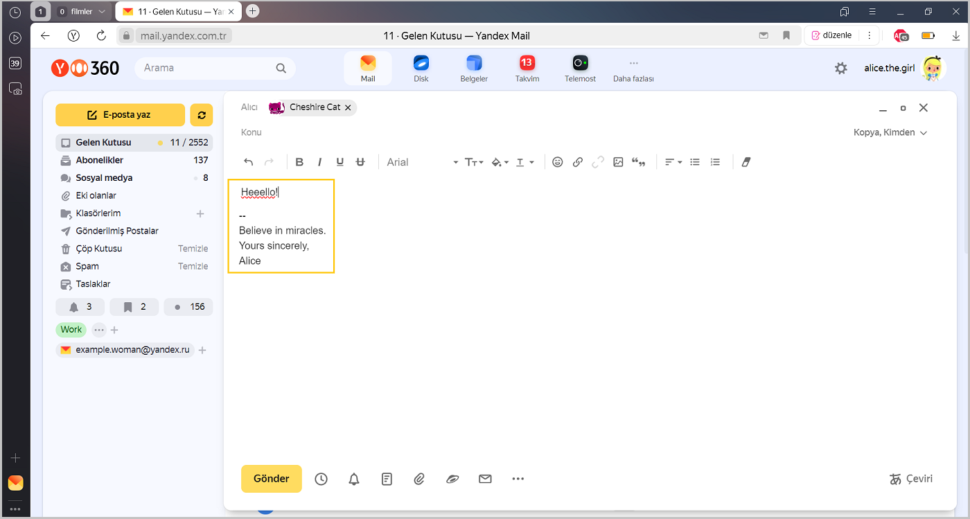 Yandex Browser, örneğin e-posta servisinin web sayfasında ileti yazarken yazımı denetler.