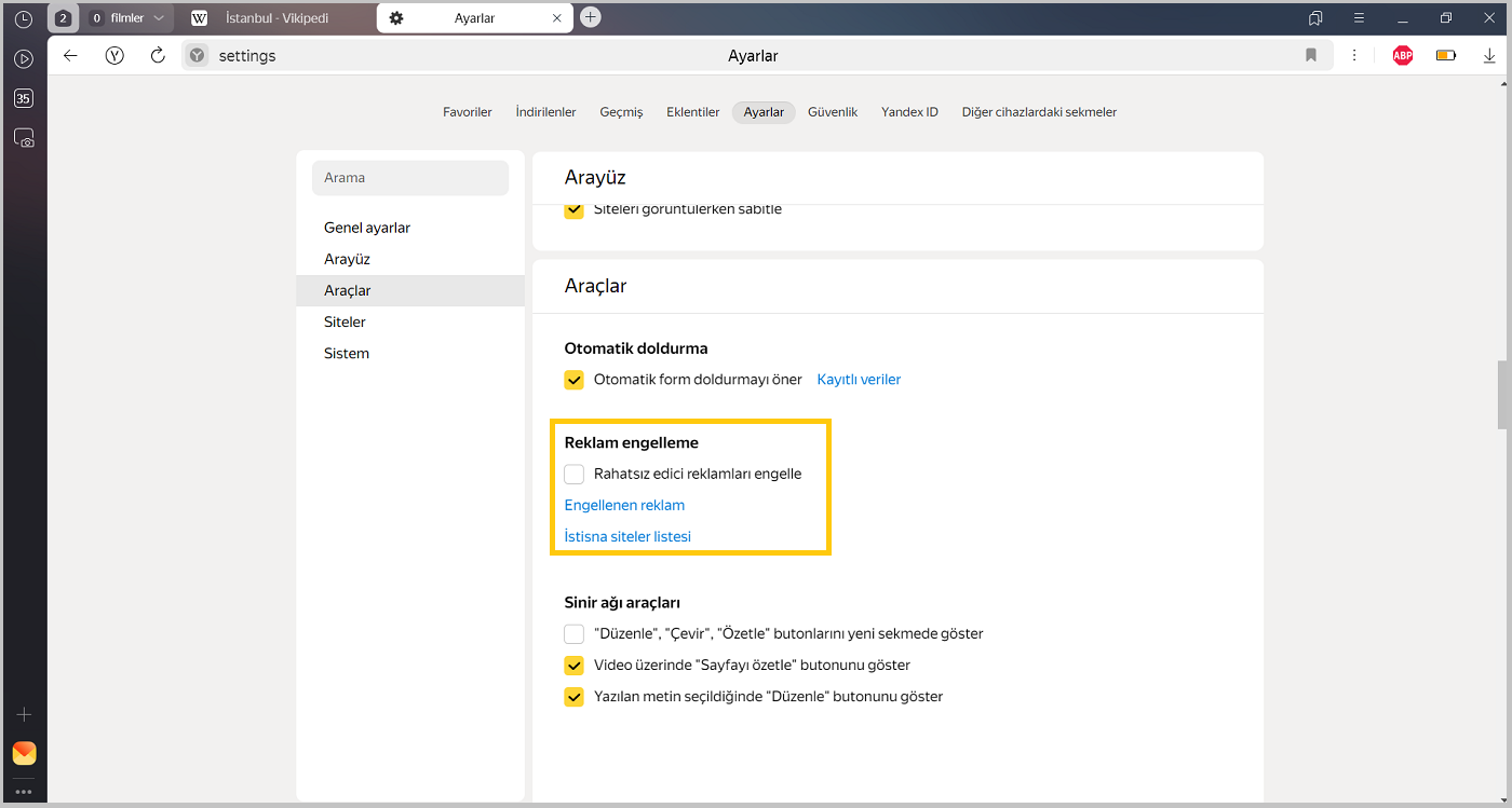 Reklam Engelleme bölümünde Rahatsız edici reklamları engelle seçeneğini devre dışı bırakın.
