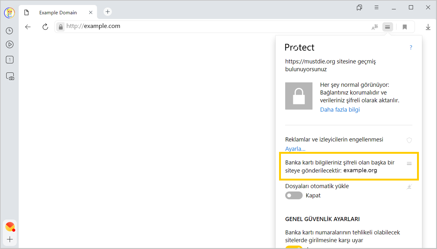 Banka kartı numarasını **** güvenli veri şifrelemesi kullanmayan example.com sitesinde girmek üzeresiniz. Ödeme bilgileriniz internet dolandırıcılarının eline geçebilir. |