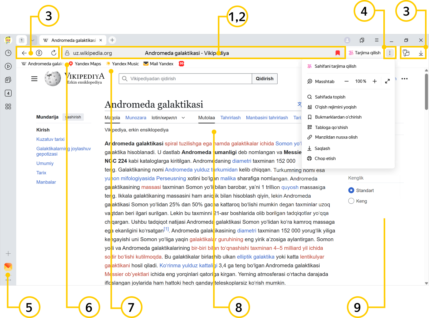 Qidiruv satrida veb-sayt manzilini yoki soʻrovingizni kiriting. Matn kiritilgach, qidiruv tavsiyalari orasida almashish uchun strelkalar yoki Tab ishlating. Siz shuningdek, Nusxa olish, Sahifani Bukmarklarga qoʻshish