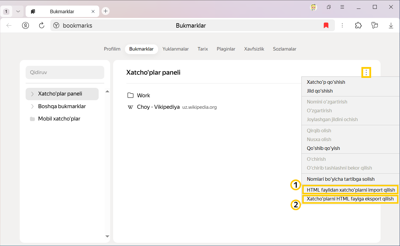 → HTML faylidan xatcho‘plarni import qilish tugmasini bosing.
