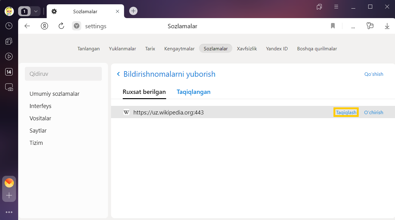 3. Yandex Brauzer varagʻida bildirishnomalarni tanlang.