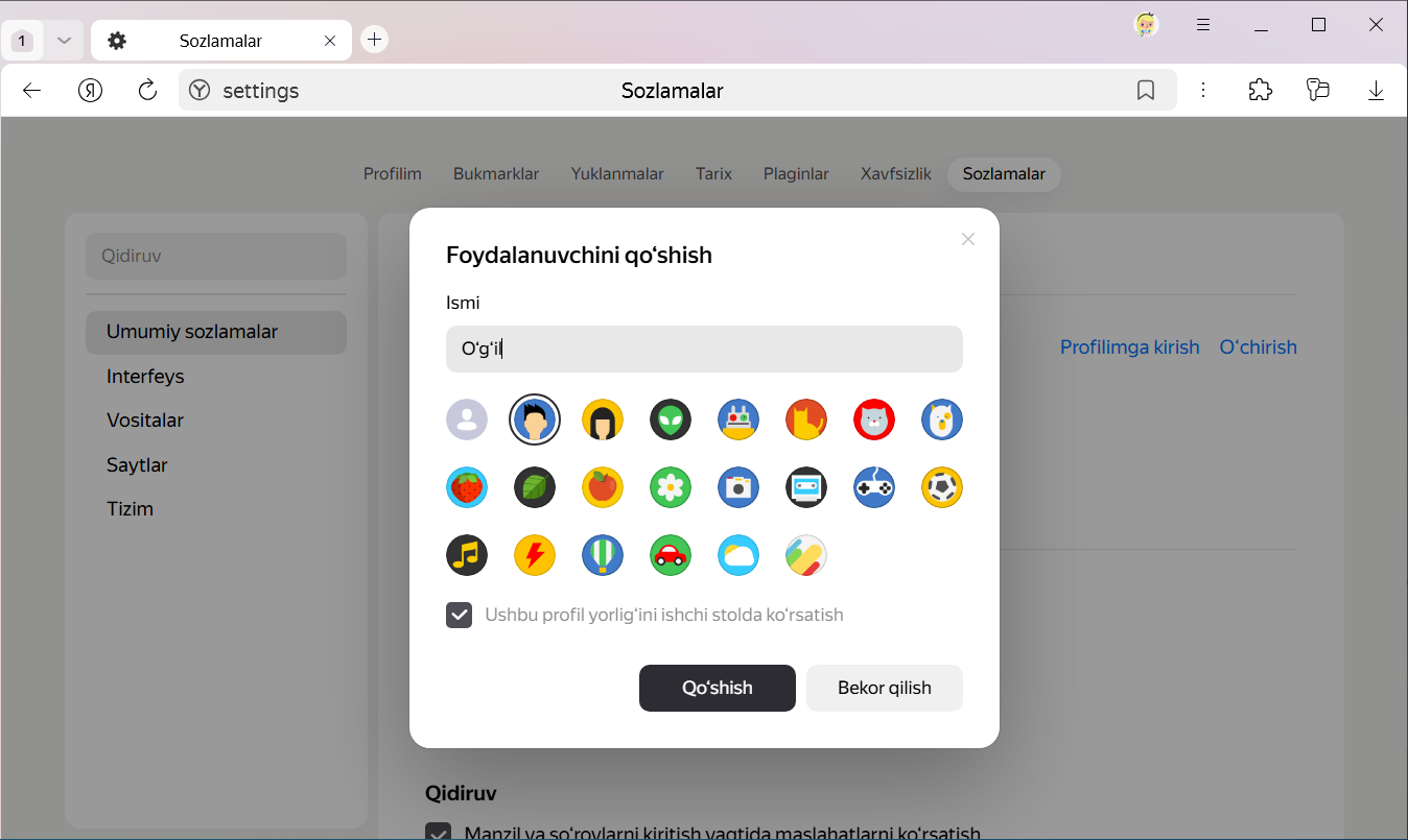 Tanlangan profil portreti bilan yangi Brauzer oynasi yaratiladi. Brauzer profillarini sozlamalarda ko‘rishingiz mumkin: