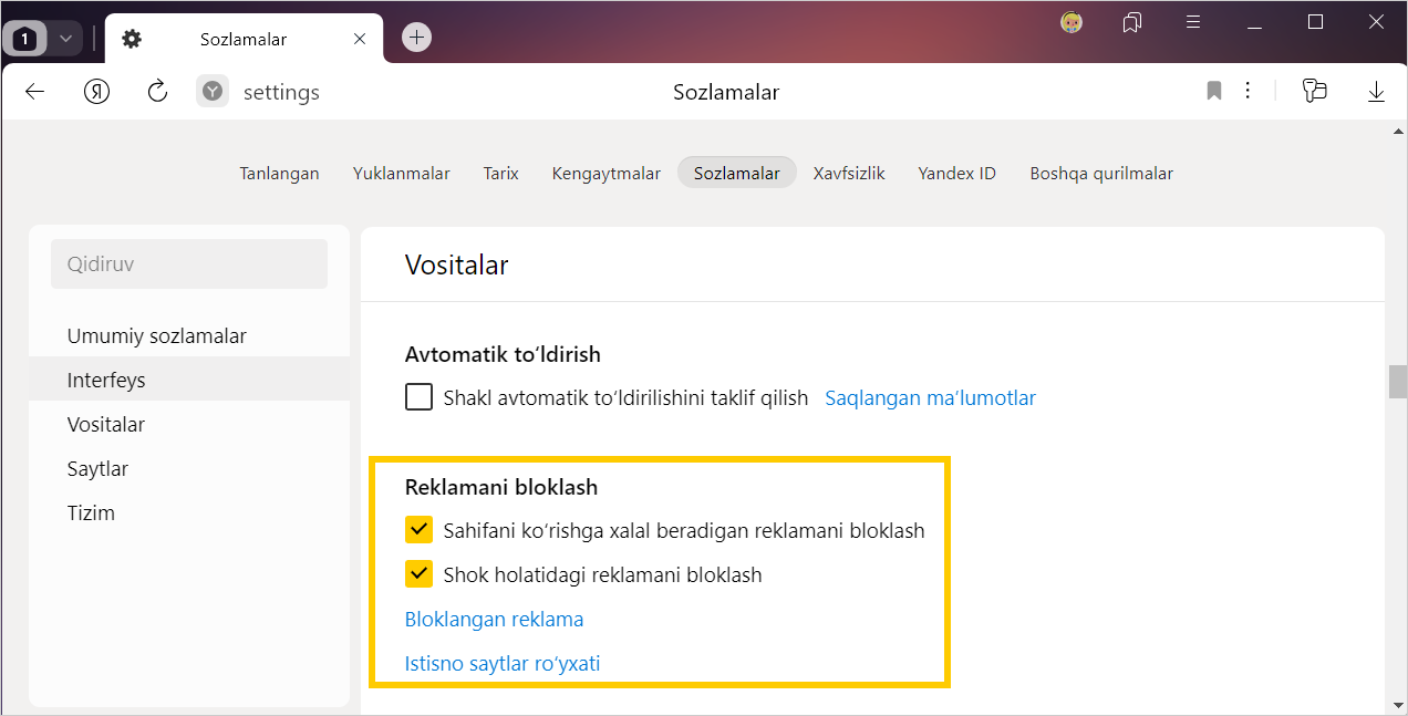 Ochilgan oynadagi Umumiy xavfsizlik sozlamalari blokida Zararli yoki yoqimsiz tasvirlar aks etgan reklamani bloklash parametrini yoqing yoki o‘chirib qo‘ying.